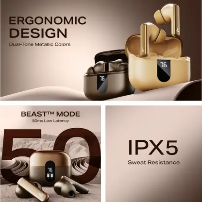 - Experience audio fun endlessly with the boAt 181 Pro TWS Earbuds. Tap your feet to your playlist on repeat as 100 hours of massive playtime has got your back. Revisit your favorite tunes while exercising, commuting, or relaxing after a tiring day. Enthralling boAt Signature Sound from two powerful 10 mm drivers adds a punch to the audio across every entertainment format. Be it movies, podcasts, or songs, these earbuds take listening to the next level. Moreover, these earbuds boast lightning-fast ASAP Charge that lends 100 minutes of playtime after 5 minutes of charging so you can return to your series or podcast in no time. Unlike most earbuds, 181 Pro is bound to turn heads with its digital display on the charging case that shows the battery level of the case and both earbuds. With IWP technology, you can experience power-packed sound immediately! Just flip the lid open and enter the audio dimension. Additionally, the ENx-powered quad mics in these earbuds are perfect for calls in public spaces. It won’t matter if you are in a crowded room, coffee shop, or on public transport- make and attend calls without looking for a quiet spot. Keeping you at the forefront of your virtual opponents, the 50 ms low latency of BEAST mode eliminates lag for a realistic feel. Call a friend, get live match scores, or play music by activating Siri or Google Voice Assistant with your using voice commands. Featuring IPX5 sweat and splash resistance, these earbuds will keep you entertained no matter where you are. Infuse a dose of audio delight into your mundane routine with 121 Pro Plus!